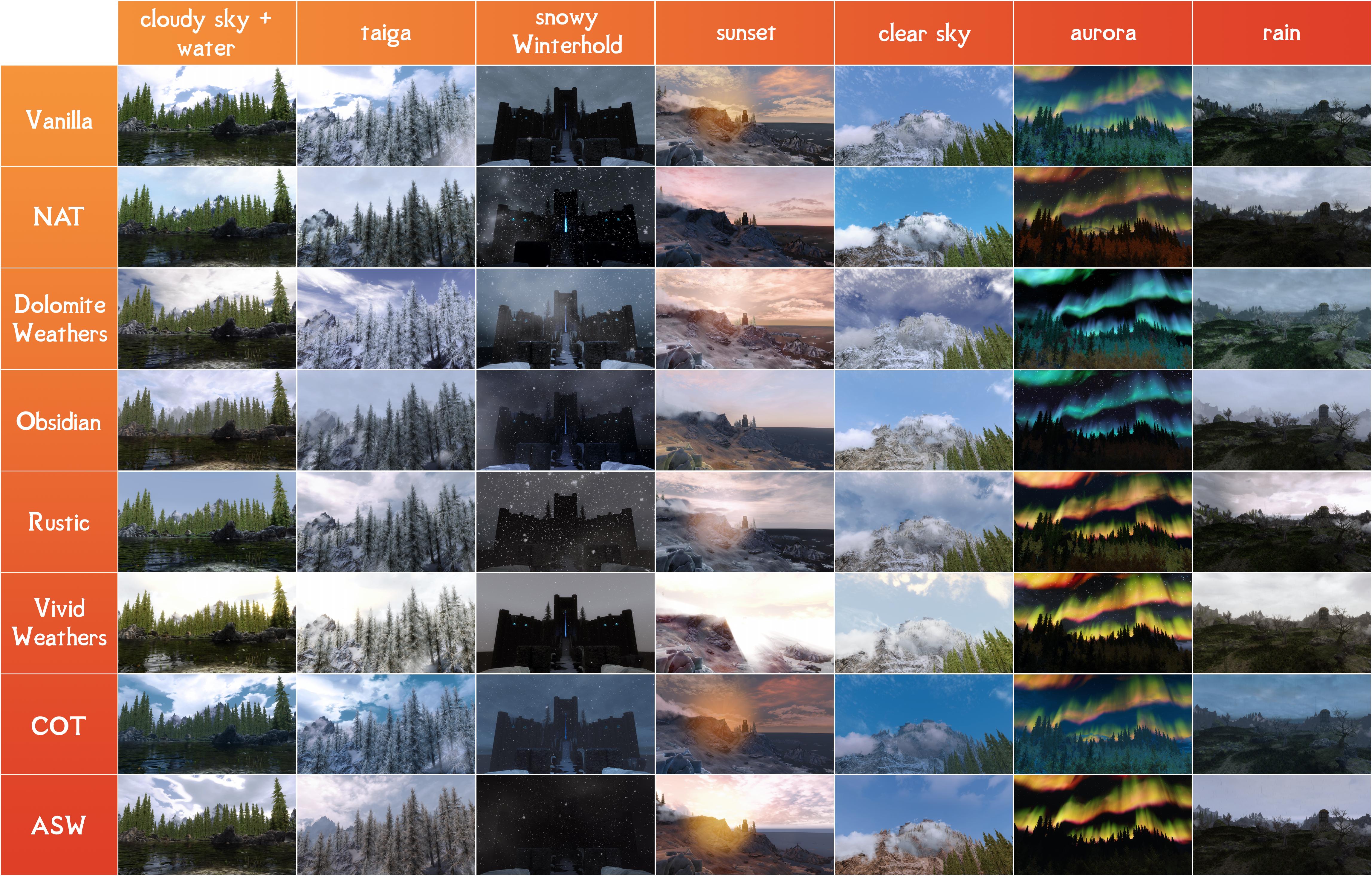 확실히 ENB 와 계절 모드는 완벽한 개인의 취향 차이기 때문에 뭐가 더 좋고 나쁜게 없습니다. 그냥 내 눈에 좋으면 장땡입니다. 이것저것 깔아보면서 원하는걸 찾아도 좋고 아니면 오늘 제가 설명드릴 가장 유명하고 많이 쓰이는 rudy enb + obsidian weather 를 설치해서 쓰시면 됩니다. 루디 enb 는 쓰고싶지만 다른 계절 모드를 사용하고 싶다면 원하는 계절모드에 맞는 루디 enb 버전을 골라서 다운받아 설치하시면 됩니다.